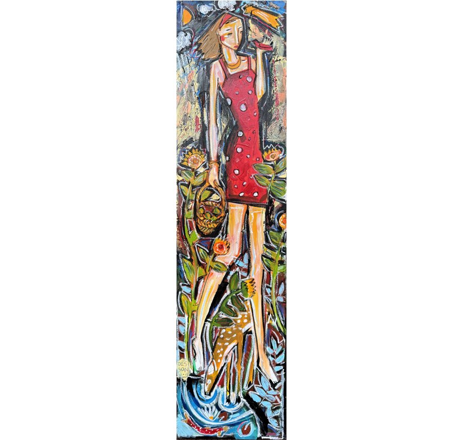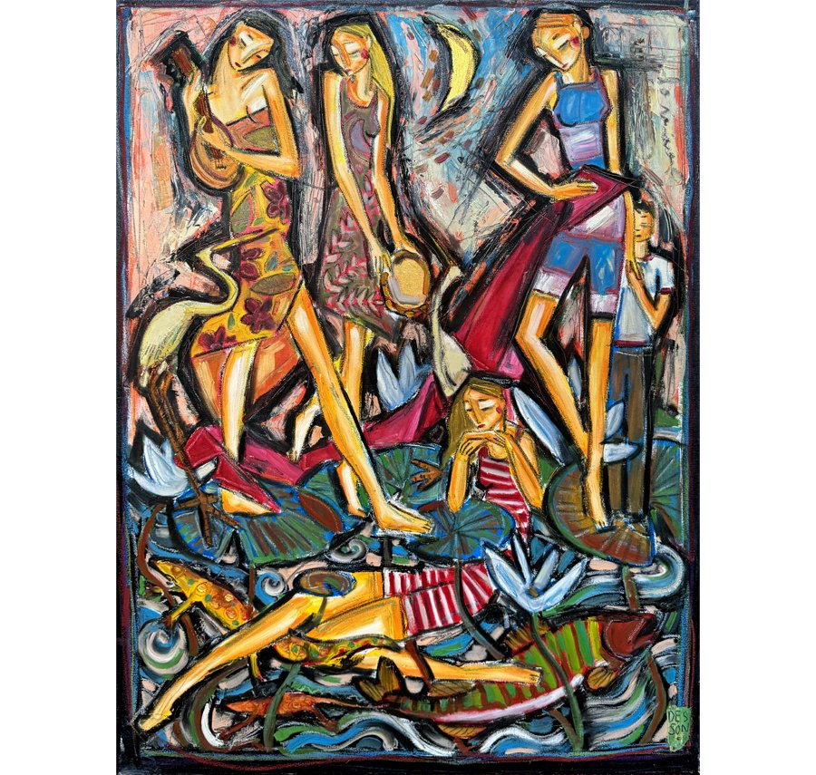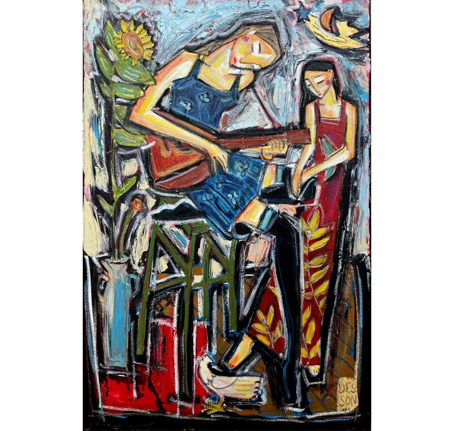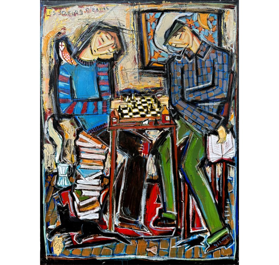 Once a drawing is chosen, Denis Chiasson transposes the outline to the canvas, which is progressively defined with the application of colour. What emerges is a painting whose subject is enhanced by strong, angular and intense lines. This meticulous process adds to his works a touch of perfectionism that is seldom seen elsewhere. His strong colours reveal an uncommon sensitivity, bringing forth touching images inhabited by a unique personal style.